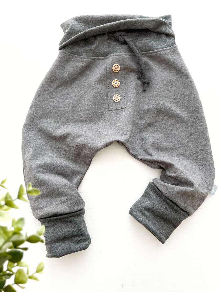 Enostavne, prožne, mehke, izjemno dolgo nosljive baggy hlačke, z okrasnimi gumbki, z dodano vrvico v pasu, kot detajlček oz. za dodatno regulacijo v pasu.