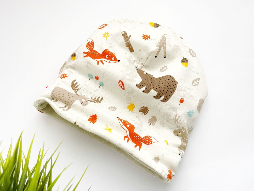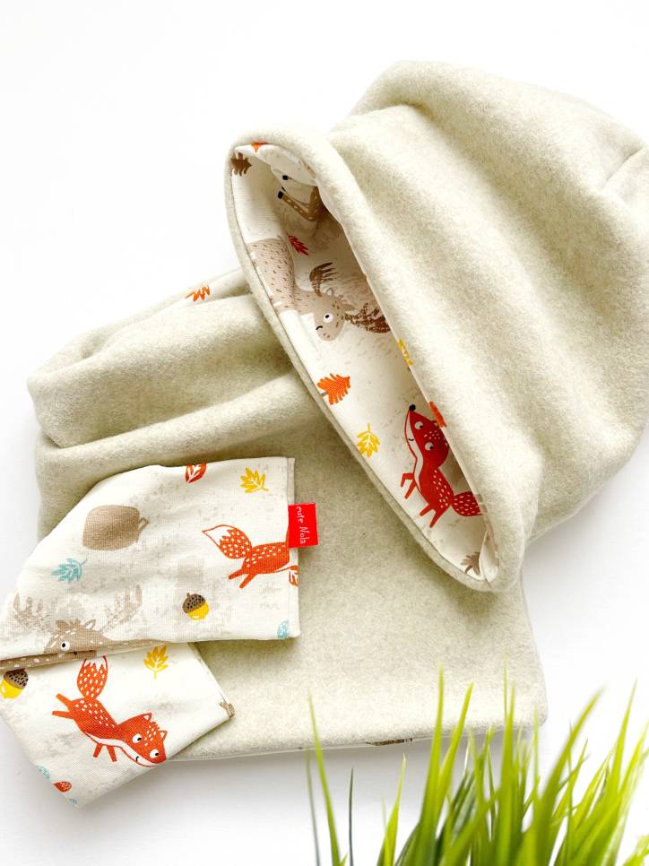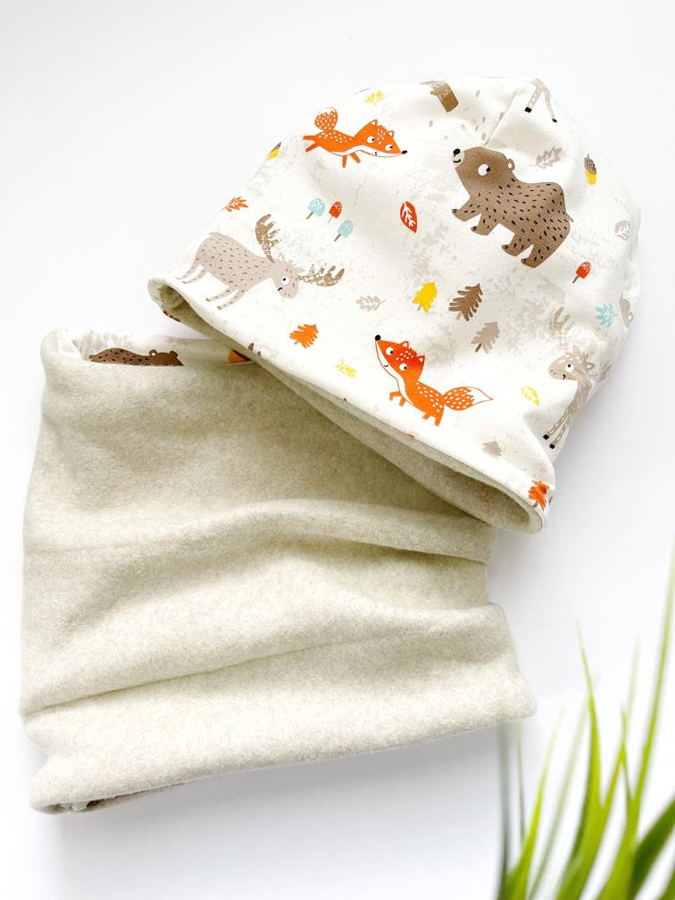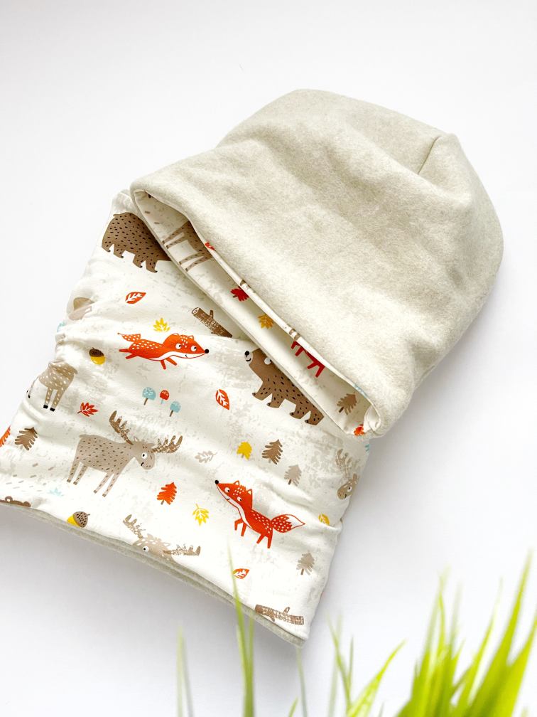 … enostavna za kombinirat, saj sta kar dve “barvni možnosti”, ena je melanž natur, druga pa z vzorčkom gozdnih živali na vanilijevi osnovi …